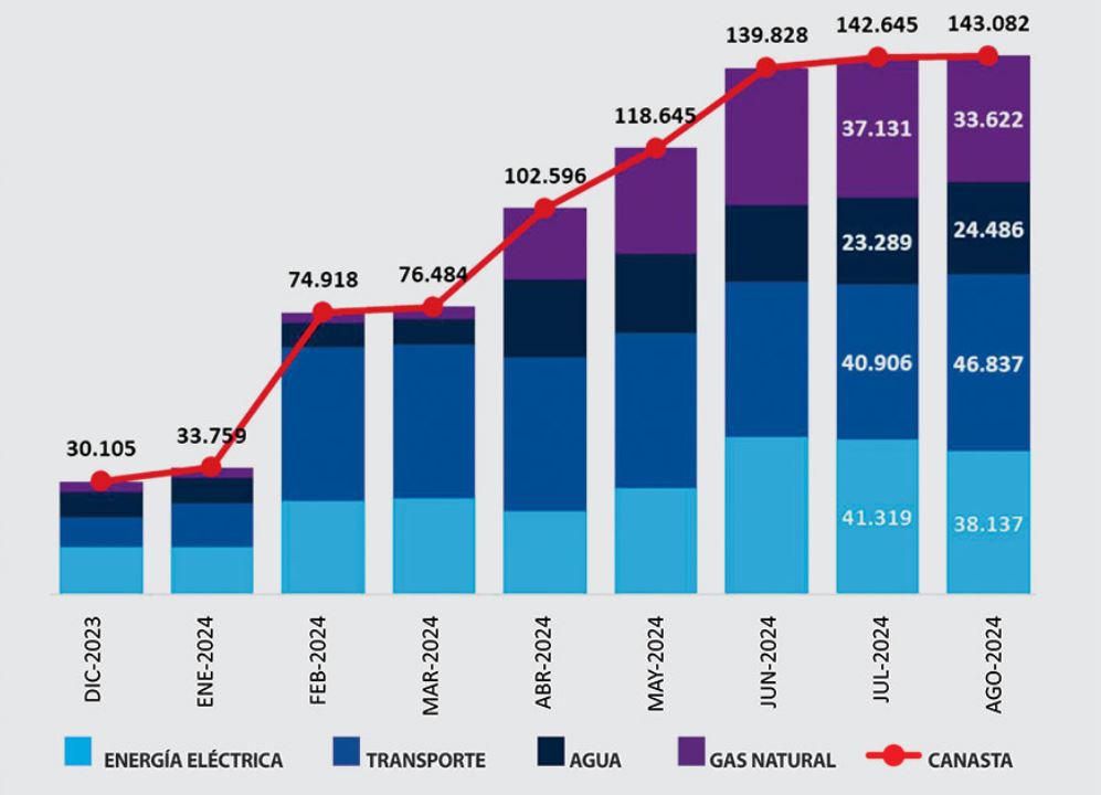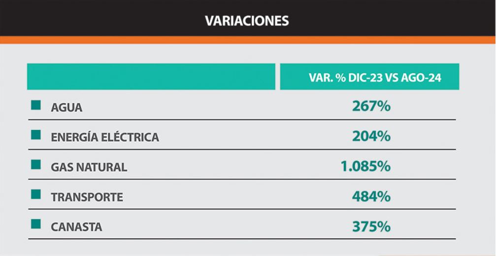 «Con respecto a diciembre de 2023, el costo de la canasta total se incrementó 375% a partir de las actualizaciones de tarifas de transporte (enero y febrero), energía eléctrica (febrero, junio y agosto), gas natural (abril y junio) y agua (abril, julio y agosto). Los consumos de gas natural y energía eléctrica están ajustados por estacionalidad del consumo», concluye el reporte.
