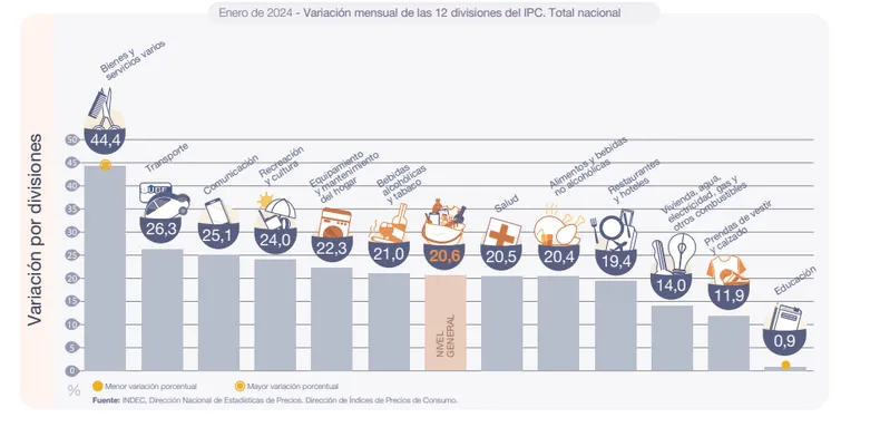 La división de mayor aumento en el mes fue Bienes y servicios varios, con un 44,4% producto del incremento en artículos de Cuidado personal. Le siguieron Transporte, con un incremento del 26,3% por las subas en transporte público y el arrastre del aumento de combustibles; y Comunicación con una suba del 25,1%, por el alza en servicios telefónicos y de internet.