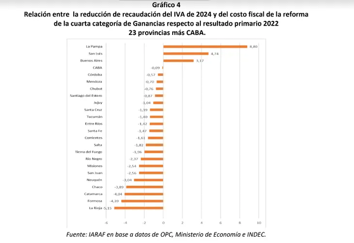 La reducción de los recursos coparticipables por las modificaciones en el Impuesto a las Ganancias y del IVA afectaría a la nación y a las provincias. Según un informe del Instituto Argentino de Análisis Fiscal (IARAF), de acuerdo al Presupuesto 2024 solamente la Ciudad de Buenos Aires y otras cuatro provincias serán superavitarias. En cambio, 19 quedarían en déficit fiscal.