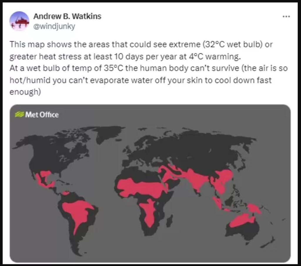 Con los datos recabados por satélites y estaciones meteorológicas, la NASA empleó un índice térmico especial, conocido como bulbo húmedo, para proyectar cómo el cambio climático afectaría la capacidad de supervivencia de las personas en diversas regiones del globo.
