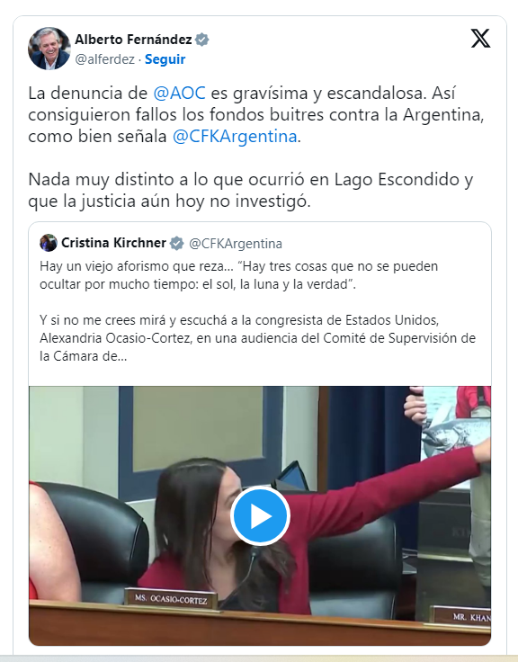 «La denuncia de Ocasio-Cortez es gravísima y escandalosa. Así consiguieron fallos los fondos buitres contra la Argentina, como bien señala @CFKArgentina. Nada muy distinto a lo que ocurrió en Lago Escondido y que la justicia aún hoy no investigó», publicó el Presidente en su cuenta de la red X (exTwitter).
