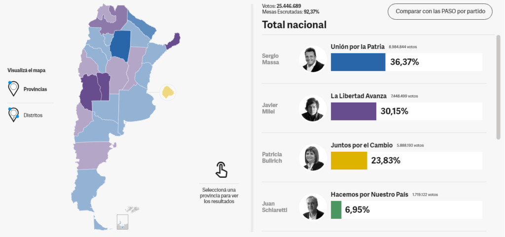 Este domingo 22 de octubre se realizaron en Argentina las elecciones presidenciales con cinco candidatos que superaron la instancia de las PASO. Los comicios cerraron a las 18 y desde ese momento el país estuvo en vilo a la espera de los resultados, que definieron que de esta primera vuelta no sale un mandatario electo sino que habrá un balotaje entre los dos más votados, el oficialista Sergio Massa (Unión por la Patria) y Javier Milei (La Libertad Avanza).