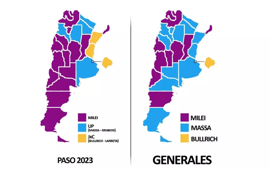 En las Primarias, Massa había superado el 35% de los votos solamente en Santiago del Estero. En las generales de este domingo se impuso con resultados contundentes en provincias como Formosa donde sacó el 52%; La Rioja con el 40%; Tucumán con el 44% y nuevamente en Santiago del Estero donde llegó al 65%.