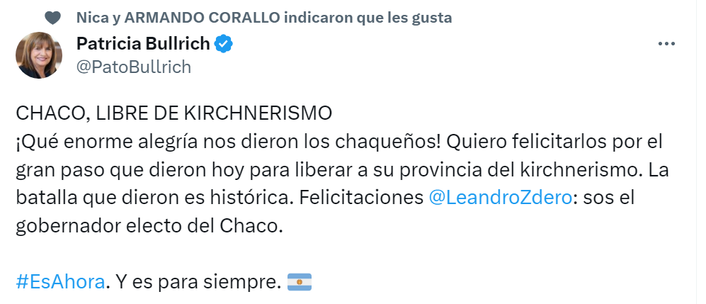 Ademas concluyo diciendo que «¡Qué enorme alegría nos dieron los chaqueños! Quiero felicitarlos por el gran paso que dieron hoy para liberar a su provincia del kirchnerismo. La batalla que dieron es histórica. Felicitaciones».