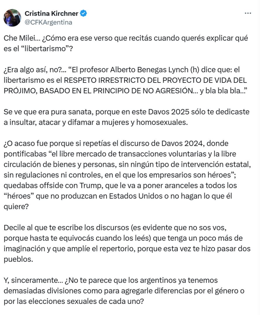 «Che Milei… ¿Cómo era ese verso que recitás cuando querés explicar qué es el ‘libertarismo’?», ironizó Cristina, aludiendo a las referencias del presidente al economista Alberto Benegas Lynch (h). “Se ve que era pura sanata, porque en este Davos 2025 solo te dedicaste a insultar, atacar y difamar a mujeres y homosexuales”, agregó.