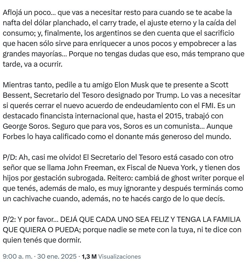 Por último, hizo referencia a Scott Bessent, el designado secretario del Tesoro de Trump, quien trabajó con George Soros y está casado con el exfiscal de Nueva York John Freeman, con quien tiene dos hijos por gestación subrogada. “Cambiá de ghostwriter porque el que tenés, además de malo, es muy ignorante y después terminás como un cachivache”, sentenció.