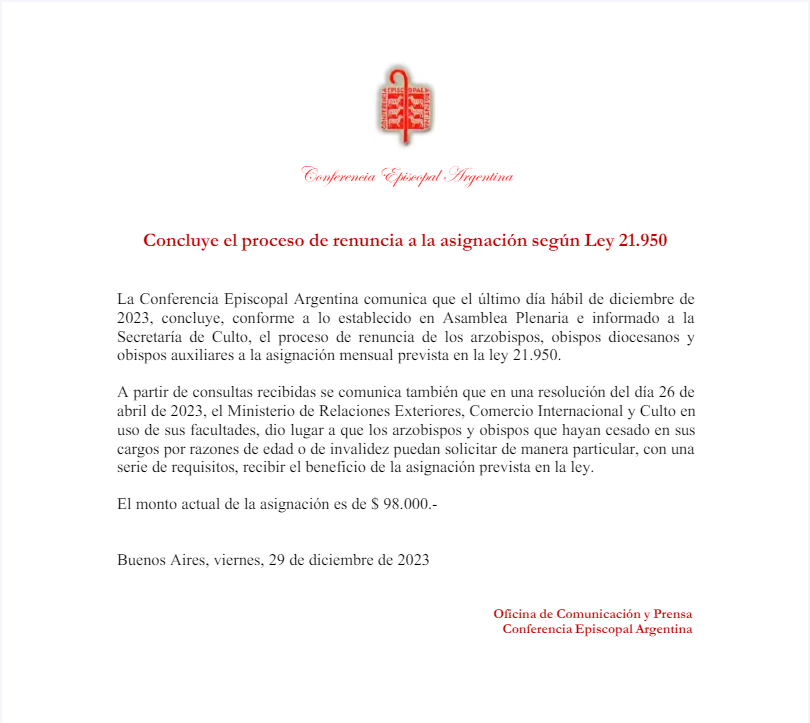 «La Conferencia Episcopal Argentina comunica que el último día hábil de diciembre de 2023, concluye, conforme a lo establecido en Asamblea Plenaria e informado a la Secretaría de Culto, el proceso de renuncia de los arzobispos, obispos diocesanos y obispos auxiliares a la asignación mensual prevista en la ley 21.950, dijeron desde la iglesia en un comunicado.