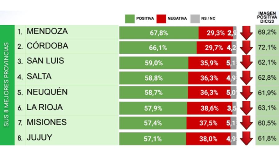 En San Luis arrojó un 59% de imagen buena (era de 62,1 en la medición anterior) y 35,9% negativa. En Salta, Neuquén, La Rioja, Misiones y Jujuy tiene entre 57,1% de imagen positiva y 58,8%, con caídas respecto a diciembre que oscilan entre 3,1 (Misiones) y 4,7 (Jujuy). Su imagen positiva en esas provincias va del 36,3% (Salta y Neuquén) al 38,6% (La Rioja).