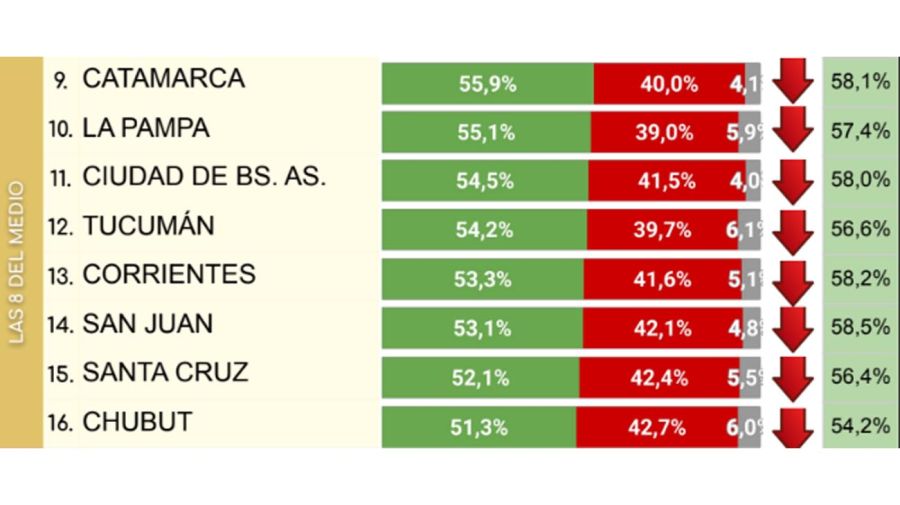 De mayor a menor imagen positiva, son las provincias de Chaco, Tierra del Fuego, Entre Ríos, Santa Fe, Provincia de Buenos Aires, Río Negro, Santiago del Estero y Formosa. En esos lugares, los porcentajes favorables al presidente oscilan entre el 41,7% y el 51,1%, con imágenes negativas de entre 52% y 46,2%. Las caídas respecto a diciembre, cuando se realizó la medición anterior, fueron de entre 2,4 y 5,2.