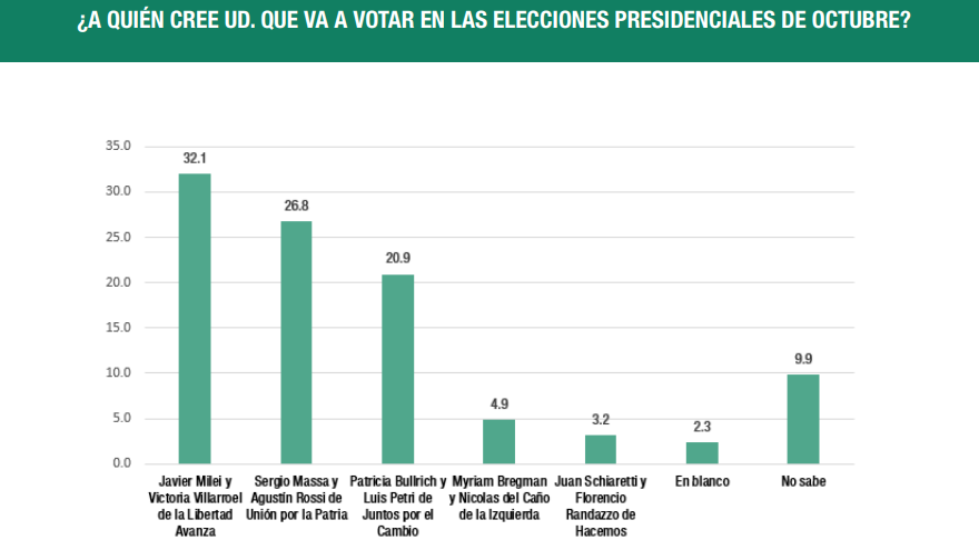 «¿A quién cree que va a votar en las elecciones presidenciales de octubre?» fue la pregunta disparador del sondeo y el 32,1% de los consultados eligió a la fórmula que integran Milei y Victoria Villarruel. El binomio oficialista de Massa y Agustín Rossi quedó segundo con el 26,8%.
