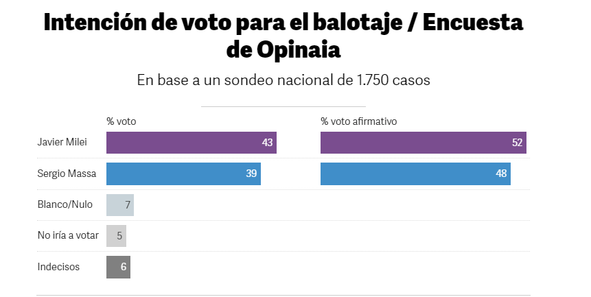 Sobre el panorama electoral electoral, Opinaia publica dos cuadros. El primero, con 7% de blanco/nulo, más 6% de indecisos y 5% que no iría a votar, Milei prevalece por 4 puntos: 43% a 39%.