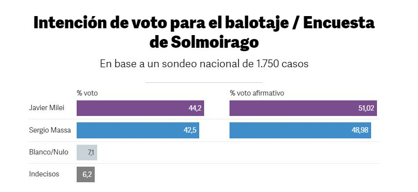 Solmoirago también publicó dos cuadros de intención de voto. En el primer caso, plantea un escenario de fuerte paridad, con Milei menos de dos puntos arriba de Massa: 44,2% a 42,5%. Completan 7,1% de blanco/impugnado y 6,2% de indecisos.