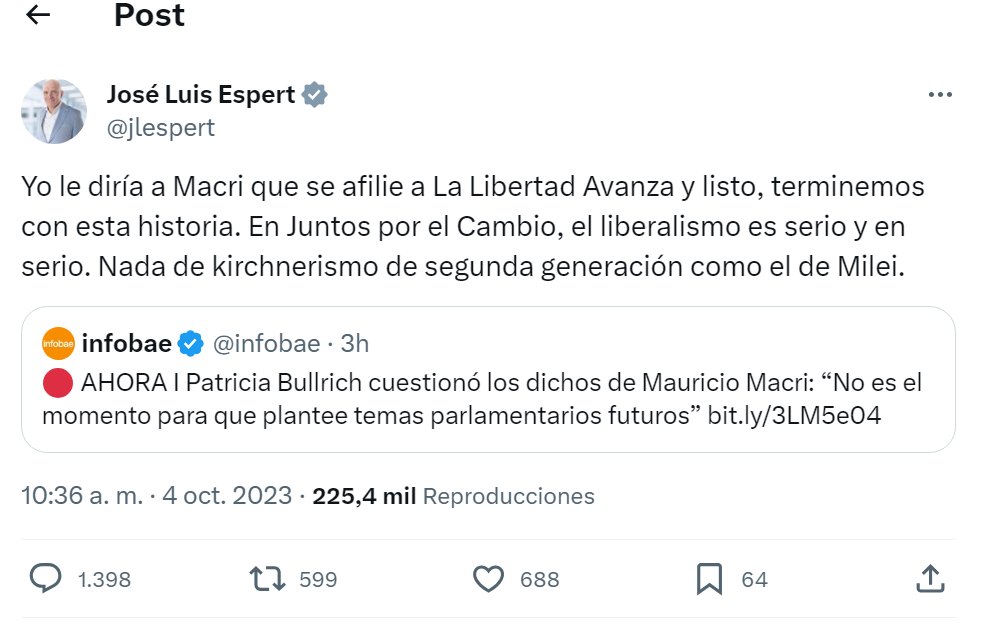«Yo le diría a Macri que se afilie a La Libertad Avanza y listo, terminemos con esta historia. En Juntos por el Cambio, el liberalismo es serio y en serio. Nada de kirchnerismo de segunda generación como el de Milei», escribió Espert en su cuenta oficial de la red social X (exTwitter), saliendo al cruce de los repetidos guiños de Macri al Libertario.