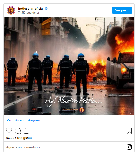 Hace tan solo cinco días, en medio de los anuncios económico, el Indio Solari publicó una imagen dónde se ven policías y un auto prendido fuego con la leyenda «Ay! Nuestra Patria…»