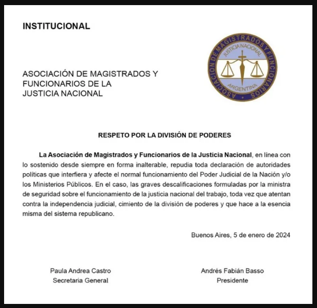 “Las graves descalificaciones formuladas por la ministra de Seguridad sobre el funcionamiento de la Justica Nacional de Trabajo, toda vez que atentan contra la independencia judicial, cimiento de la división de poderes y que hace a la esencia misma del sistema republicano”, concluye el texto.