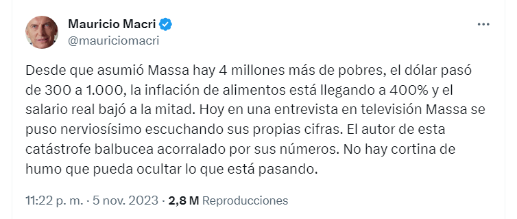 El expresidente Mauricio Macri, cruzó al candidato de Unión por la Patria, Sergio Massa, por los números de la economía y aseguró que, desde que asumió como ministro de Economía, «hay 4 millones más de pobres, el dólar pasó de $300 a $1.000, la inflación de alimentos está llegando a 400% y el salario real bajó a la mitad».
