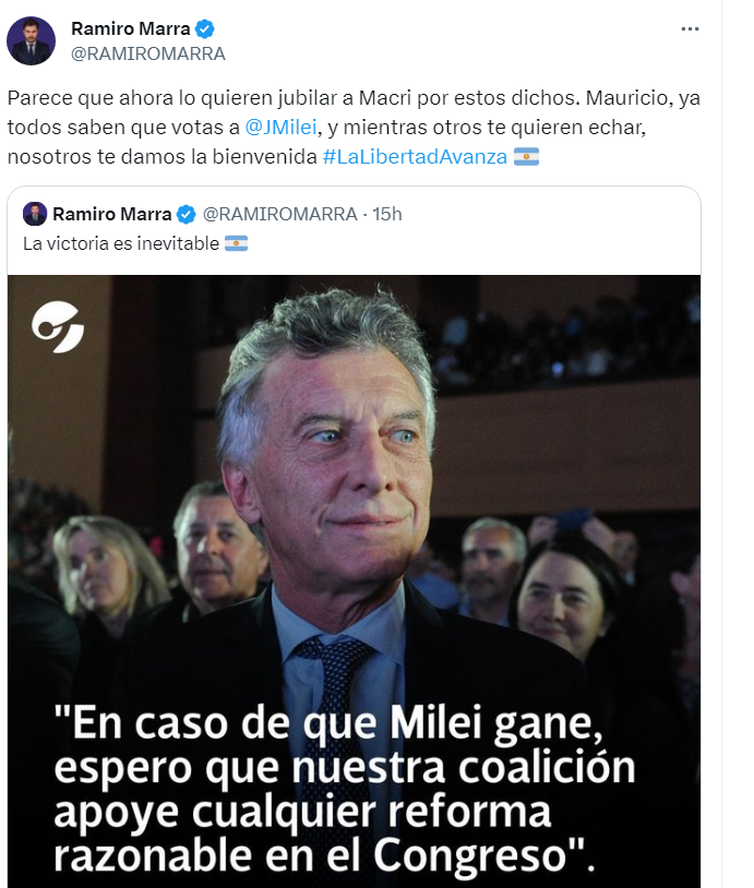 «Parece que ahora lo quieren jubilar a Macri por estos dichos. Mauricio, ya todos saben que votás a Javier Milei, y mientras otros te quieren echar, nosotros te damos la bienvenida a La Libertad Avanza», escribió Marra en su cuenta de la red social X (exTwitter).