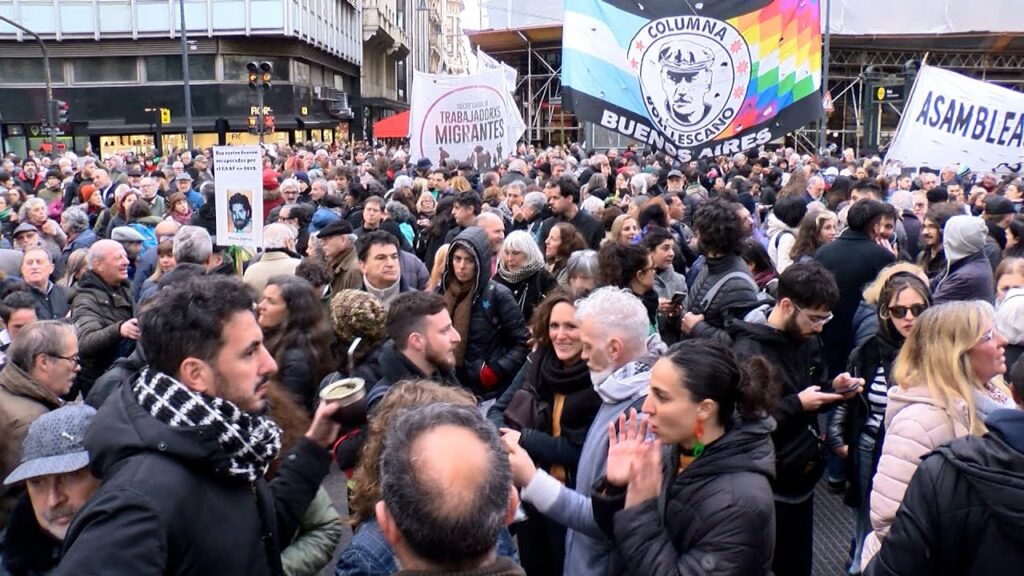 En la esquina de Perú y Diagonal Sur se montó un escenario. Carlos Lordkipanidse —sobreviviente de la ESMA e integrante del Encuentro Militante Cachito Fukman— oficiaba casi de maestro de ceremonias. Desde allí se leyó tanto el documento de la mesa de organismos como del Encuentro Memoria, Verdad y Justicia. “Lo importante es la unidad en la acción cuando buscan tergiversar la historia”, dice Adriana Taboada, referente de la Comisión Zona Norte. “Hablemos de la mala fe de Villarruel que habla de su padre —Eduardo Villarruel— como un veterano de Malvinas y esconde el rol en el genocidio. La que pide memoria esconde el pasado”, apunta Taboada.