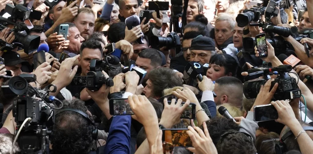 «Estamos en condiciones de hacer el mejor gobierno de la historia», respondió Milei cuando le consultaron sobre la gobernabilidad, en medio de un caos absoluto de prensa, policía, seguidores y curiosos que intentaban acceder entre forcejeos al candidato de La Libertad Avanza.