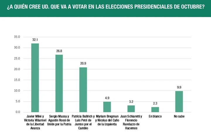 El informe que difundieron sólo trae los datos de intención de voto. «¿A quién cree usted que va a votar en las elecciones presidenciales de octubre?», preguntan. Y se dan estos resultados: