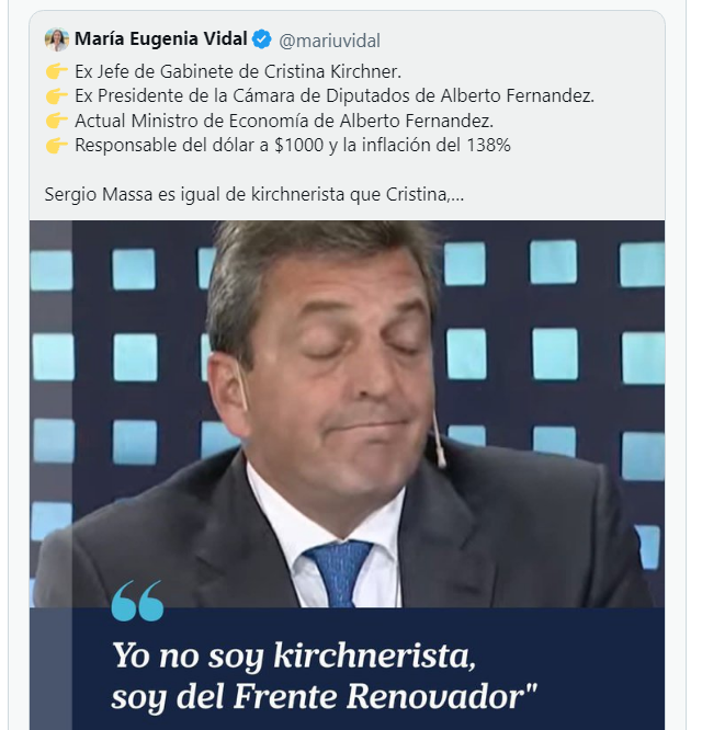 La dirigente del PRO utilizó para su publicación una placa que resalta los dichos del titular del Palacio de Hacienda, quien aseguró que no es kirchnerista sino del Frente Renovador. «Responsable del dólar a $1.000 y la inflación del 138%. Sergio Massa es igual de kirchnerista que Cristina, Alberto y Axel», continuó Vidal.